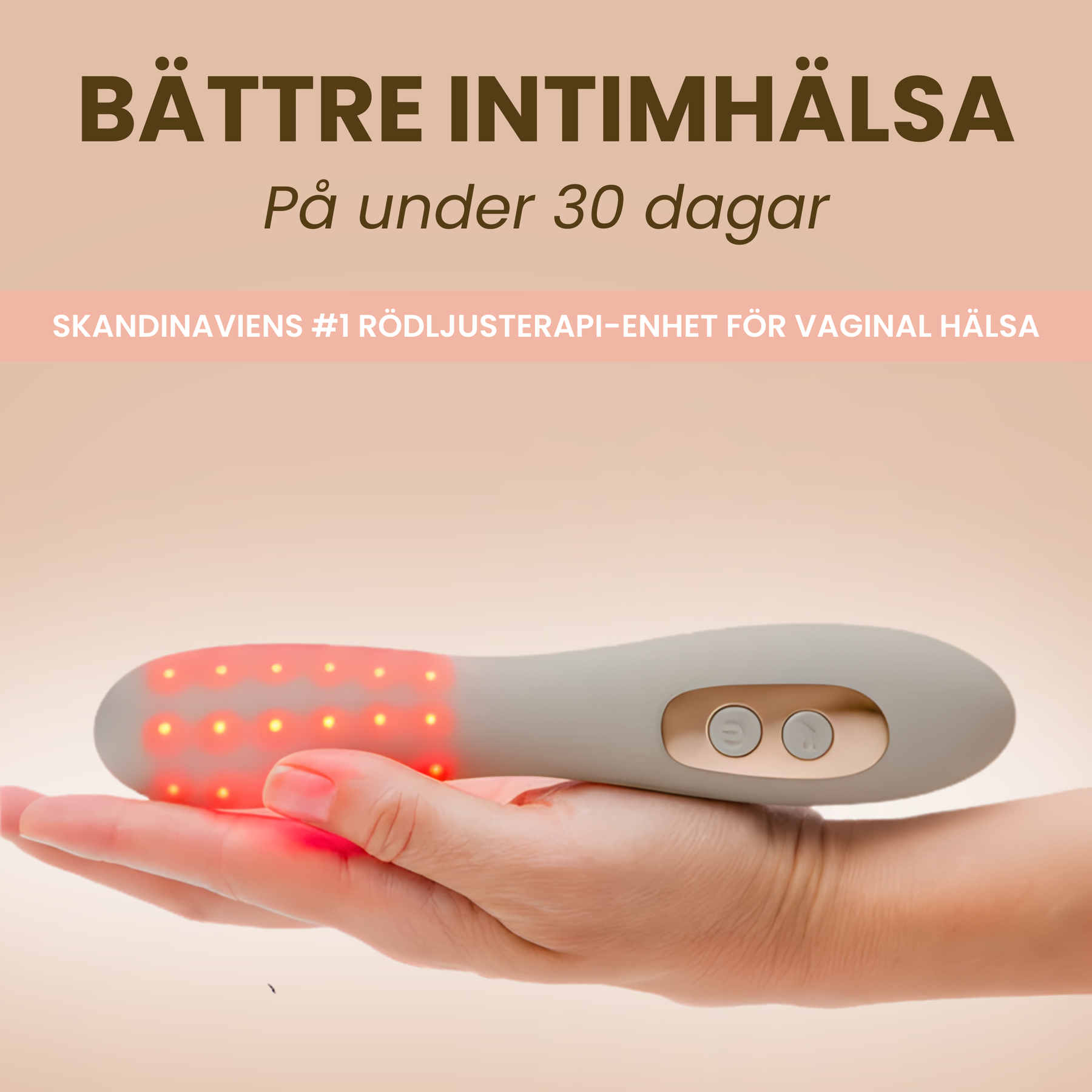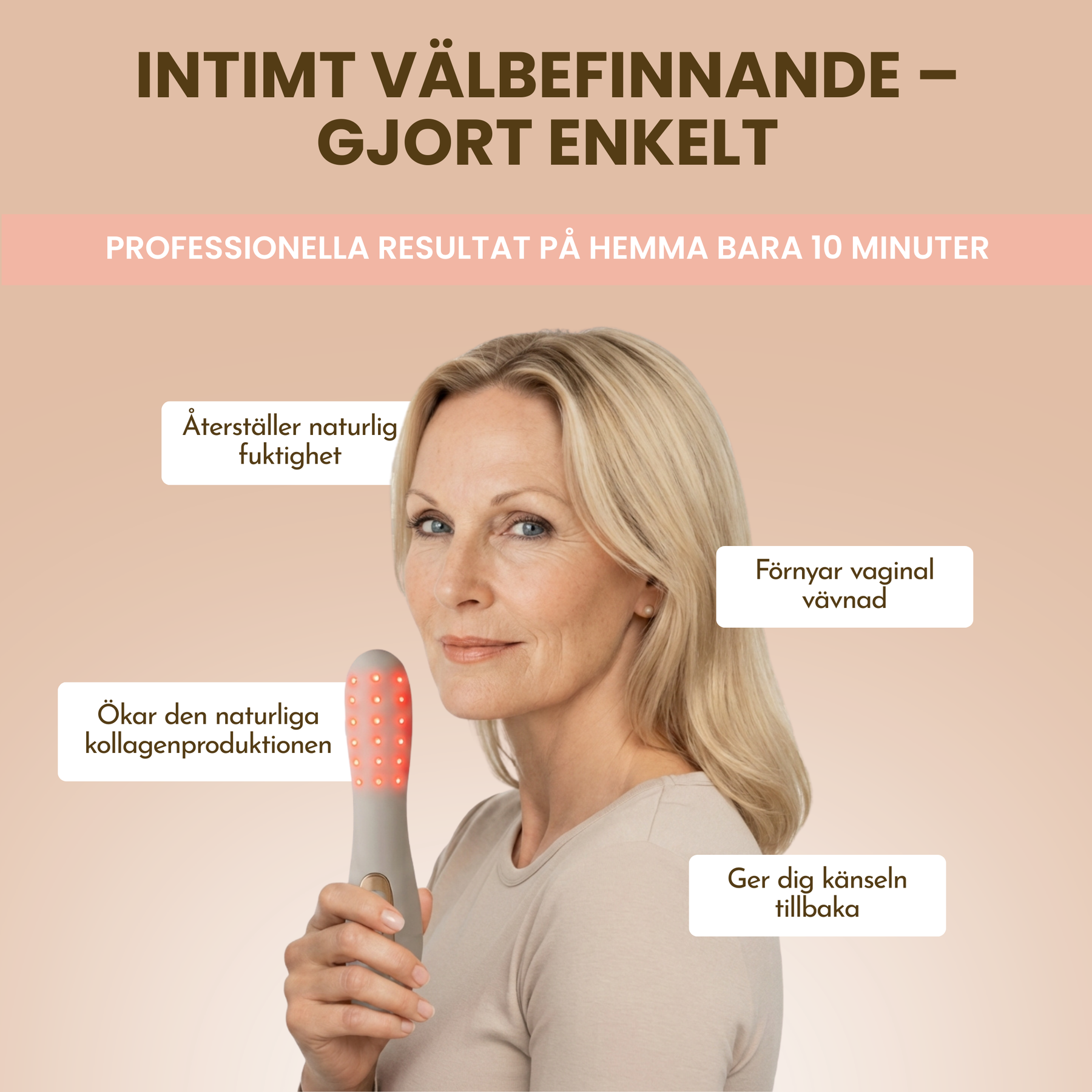 Intimstaven – Verkar på cellnivå. Rödljusbehandling stimulerar kroppen att stödja vävnadens förnyelse, producera kollagen och återställa naturlig fukt inifrån.