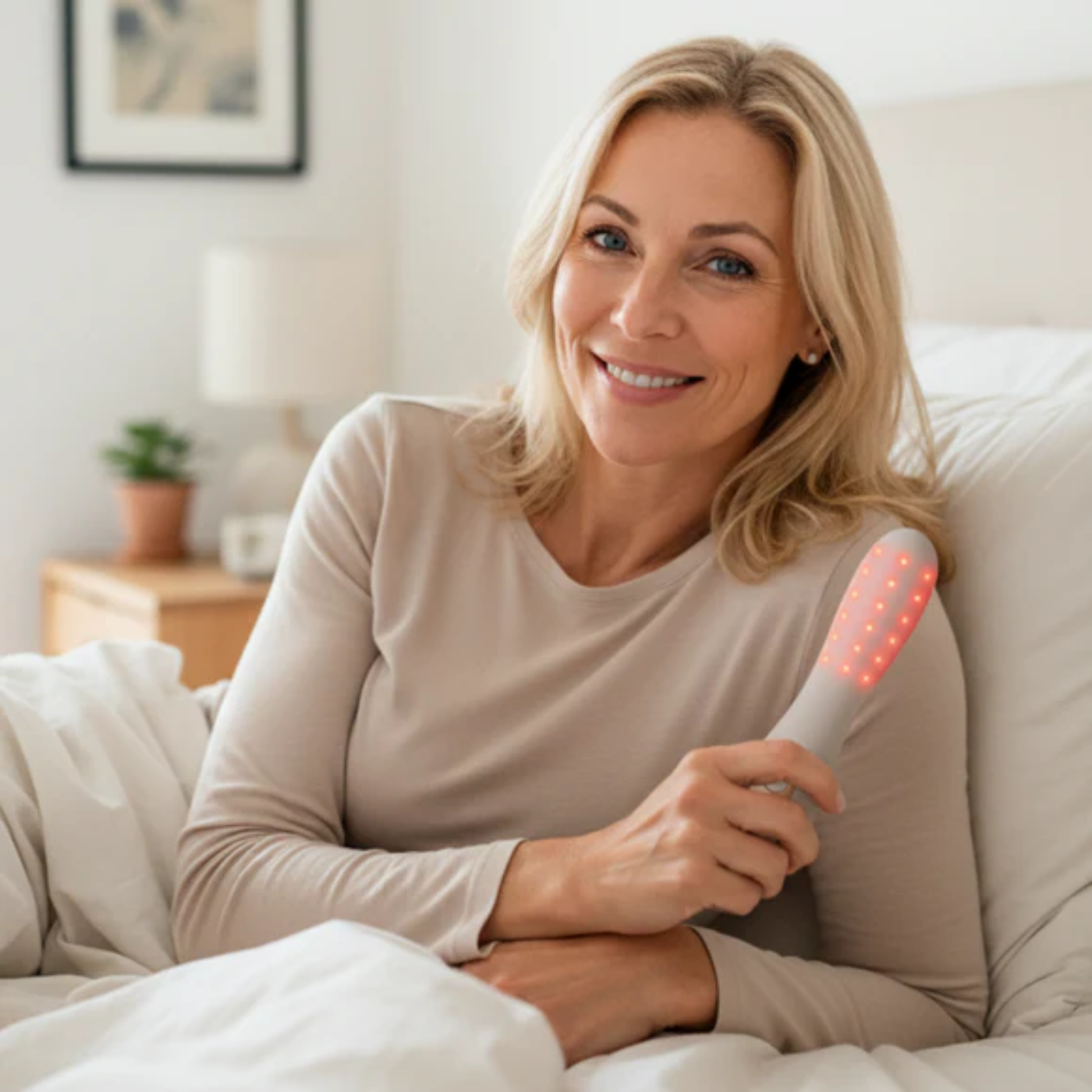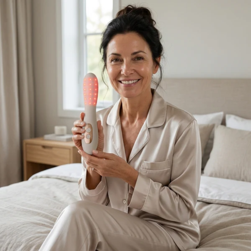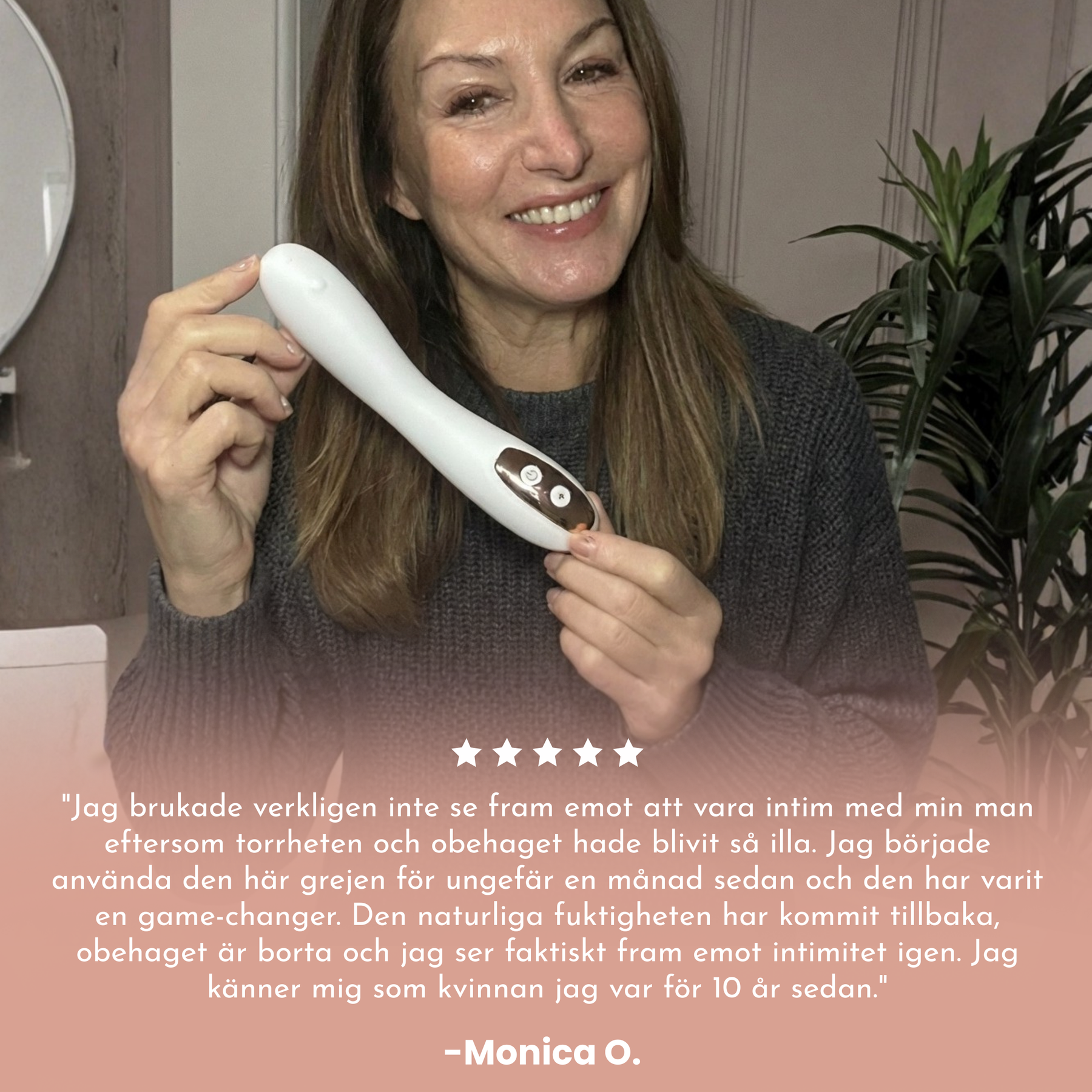 Enheten använder ljus, värme och vibration – inte hormoner – för att stödja intimhälsan på ett naturligt sätt.