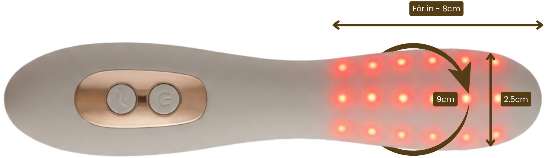 Mindre än du tror – Intimstaven är slank och ergonomisk, med en behandlingsyta på cirka 8 cm i längd och 2,5 cm i bredd, designad för bekväm användning.